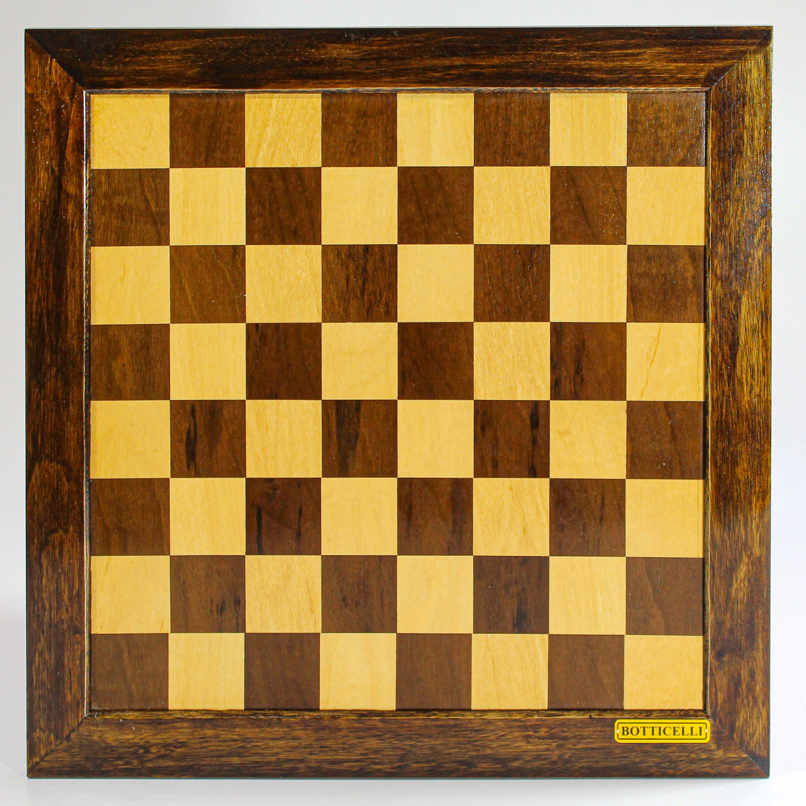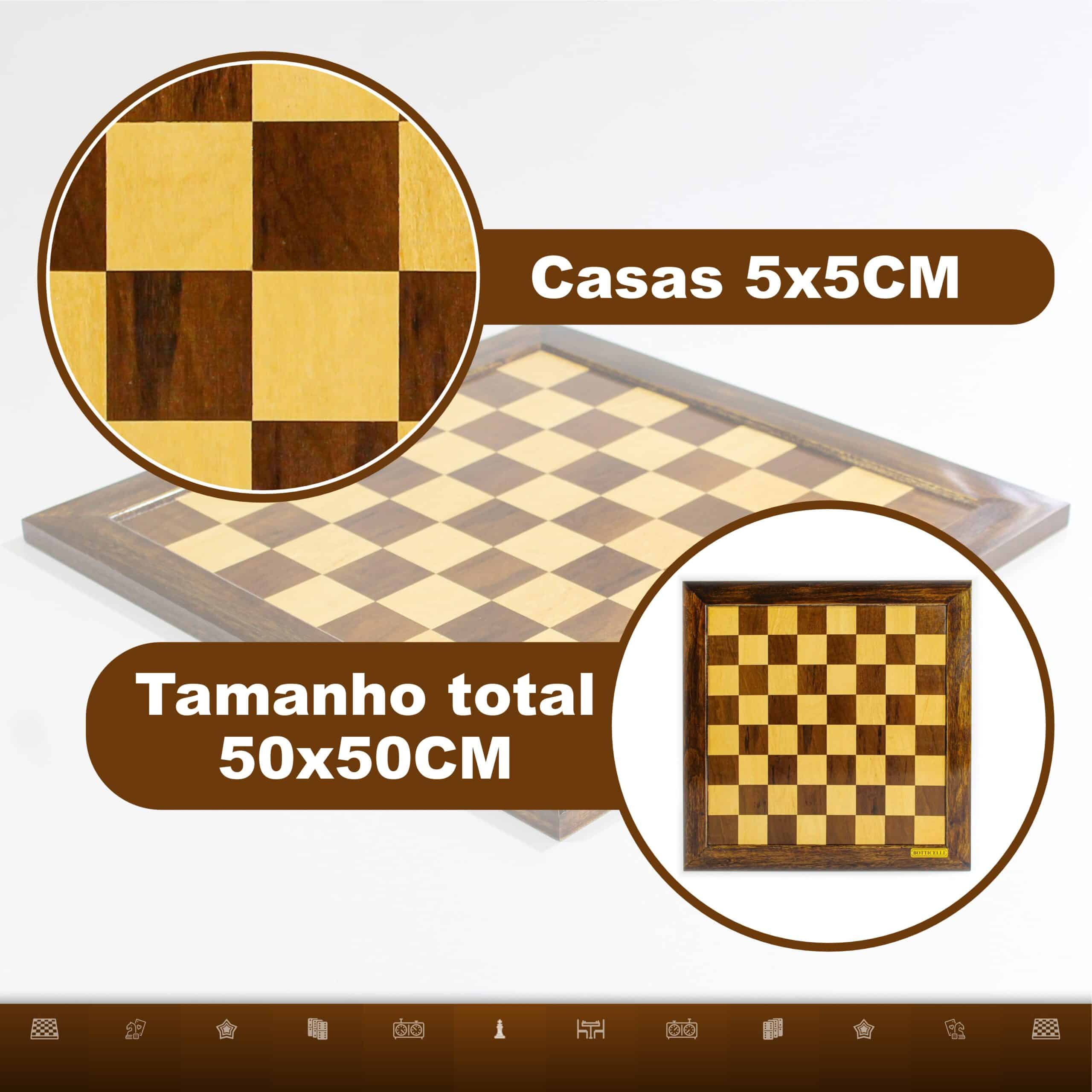 Tabuleiro em madeira marchetado para xadrez e damas, indicado para quem procura um modelo de bom porte e leitura confortável. A versão de referência 124 traz casas de 5 x 5 cm e mantém o visual clássico do acabamento em madeira.